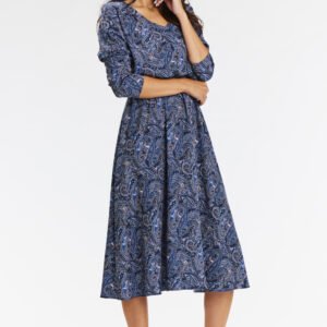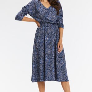 Zwiewna sukienka kimonowa midi z długimi rękawami. Dodaj wyjątkowego stylu do swojej garderoby z elegancką sukienką kimonową midi w granatowym wzorze. Idealna na każdą okazję, od pracy po eleganckie kolacje. Sukienka posiada długie rękawy, które można podwinąć do 3/4, a dekolt w V pięknie wydłuża szyję. Zwiewny dół i wszyty pasek w talii podkreślają kobiecą sylwetkę. Sukienka wykonana z wysokiej jakości tkaniny. Idealnie komponuje się z botkami, kozakami i kowbojkami. Sukienka świetnie sprawdzi się do pracy, na spotkania czy eleganckie kolacje. Wszechstronny krój i kobiecy design czynią ją idealnym wyborem na różne okazje.