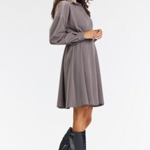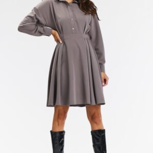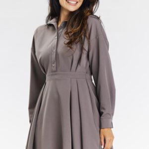 Elegancka, koszulowa sukienka rozkloszowana, w kolorze taupe. Dodaj do swojej garderoby elegancję z naszą szarą sukienką koszulową, idealną na formalne i biznesowe okazje. Rozkloszowany dół, długość do kolan oraz długie rękawy zakończone mankietami podkreślają kobiecość i styl. Kołnierzyk na stójce i zapięcie na guziki z przodu dodają nowoczesnego wyglądu. Sukienka zapinana na guziki, zapewnia komfort noszenia i elegancję. Kolor szary sprawia, że jest wszechstronna i łatwo łączy się ze szpilkami lub kozakami. Starannie uszyta z wysokiej jakości materiałów. Idealna na spotkania biznesowe, eleganckie uroczystości i formalne wyjścia.