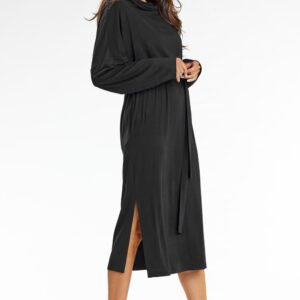 Kimonowa sukienka midi z golfem i długimi rękawami z wiskozy. Dodaj nowoczesny akcent do swojej garderoby z czarną luźną kimonową sukienką midi. Idealna na co dzień, do pracy lub na spotkania z przyjaciółkami, łączy wygodę z casualowym stylem. Luźny golf oraz gumka w talii podkreślają sylwetkę, a rozcięcia po bokach dodają lekkości. Wykonana z dzianiny wiskozowej, sukienka zapewnia lekkość i przewiewność. Czarny kolor sprawia, że jest wszechstronna, świetnie komponując się z różnymi butami, od kowbojek po trampki. Idealna na codzienne wyjścia, do pracy czy na swobodne spotkania.