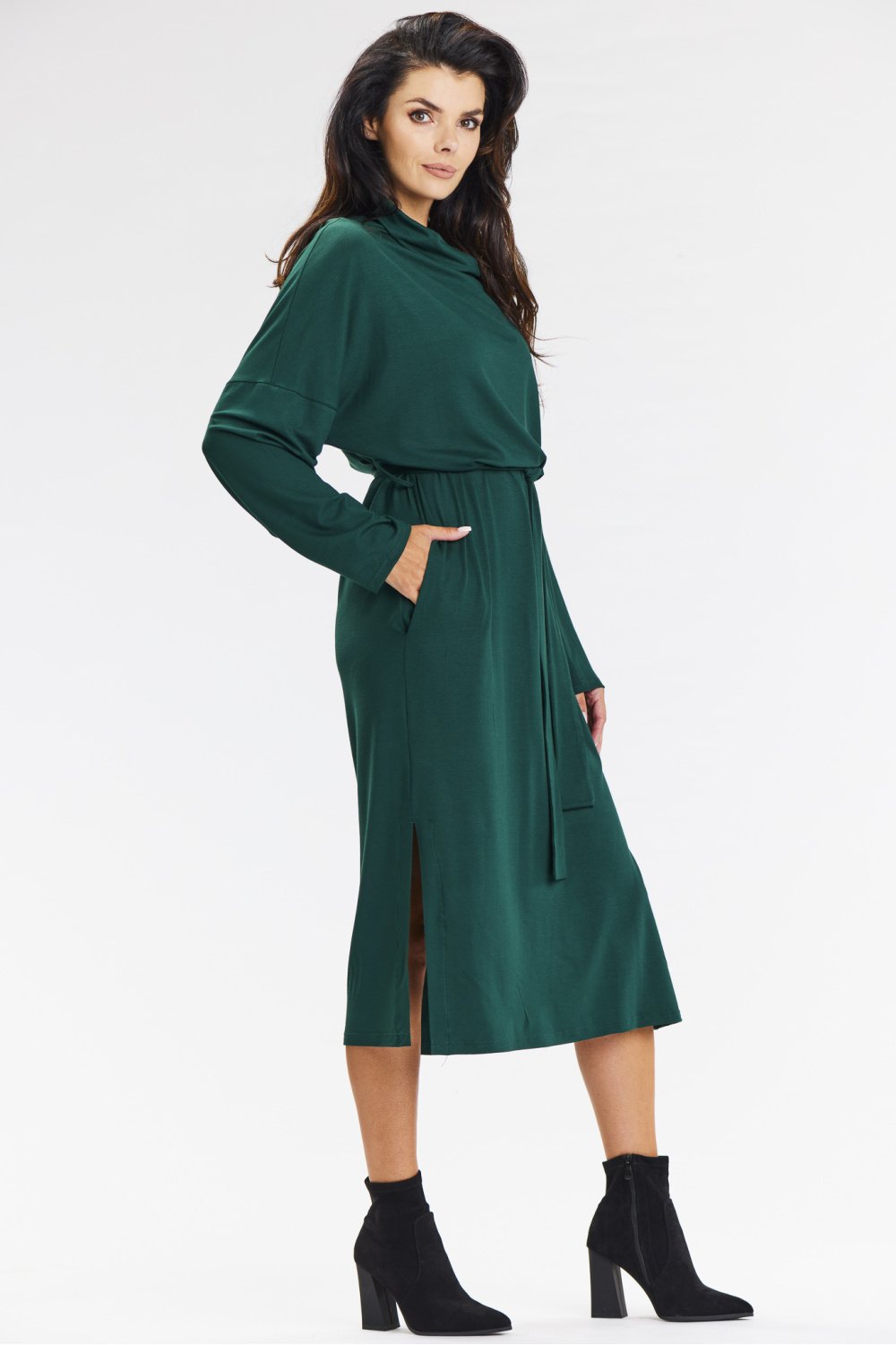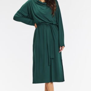 Kimonowa sukienka midi z golfem i długimi rękawami z wiskozy. Dodaj nowoczesny akcent do swojej garderoby z zieloną luźną kimonową sukienką midi. Idealna na co dzień, do pracy lub na spotkania z przyjaciółkami, łączy wygodę z casualowym stylem. Luźny golf oraz gumka w talii podkreślają sylwetkę, a rozcięcia po bokach dodają lekkości. Wykonana z dzianiny wiskozowej, sukienka zapewnia lekkość i przewiewność. Czarny kolor sprawia, że jest wszechstronna, świetnie komponując się z różnymi butami, od kowbojek po trampki. Idealna na codzienne wyjścia, do pracy czy na swobodne spotkania.