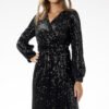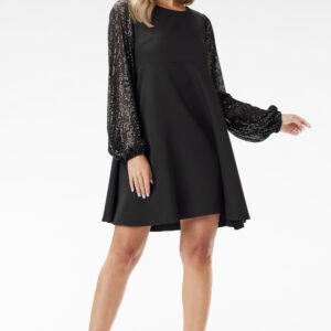 Sukienka trapezowa mini z cekinowymi rękawami Elegancka sukienka trapezowa mini z cekinowymi rękawami od polskiej marki Awama. Idealna na wyjątkowe okazje, takie jak randki, wyjścia do teatru czy święta. Trapezowy krój subtelnie tuszuje sylwetkę, zapewniając lekkość i komfort noszenia. Cekinowe rękawy dodają blasku i przyciągają spojrzenia. Półokrągły dekolt elegancko eksponuje szyję, dodając kobiecego uroku. Sukienka zapinana na zamek kryty, co gwarantuje idealne dopasowanie do sylwetki. Must-have na każdą elegancką okazję!