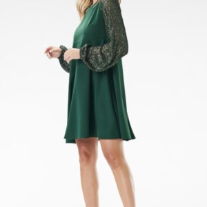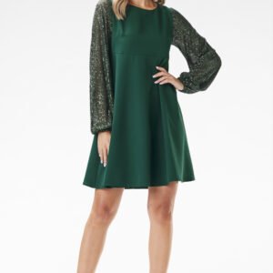 Sukienka trapezowa mini z cekinowymi rękawami Elegancka sukienka trapezowa mini z cekinowymi rękawami od polskiej marki Awama. Idealna na wyjątkowe okazje, takie jak randki, wyjścia do teatru czy święta. Trapezowy krój subtelnie tuszuje sylwetkę, zapewniając lekkość i komfort noszenia. Cekinowe rękawy dodają blasku i przyciągają spojrzenia. Półokrągły dekolt elegancko eksponuje szyję, dodając kobiecego uroku. Sukienka zapinana na zamek kryty, co gwarantuje idealne dopasowanie do sylwetki. Must-have na każdą elegancką okazję!