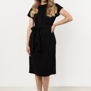 Elegancja w prostocie, ta sukienka to doskonały wybór na wiele okazji. Wykonana z miękkiego materiału, zapewnia komfort przez cały dzień. Krótkie rękawki i dekolt w łódkę nadają jej subtelności, a wiązanie w talii podkreśla sylwetkę. Klasyczny fason sprawia, że łatwo ją stylizować zarówno na co dzień, jak i na wyjątkowe wyjścia.
