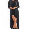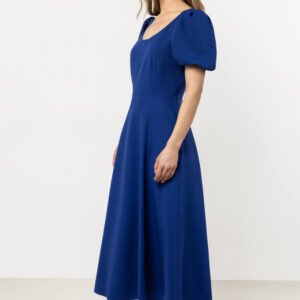 Elegancja i wygoda, ta sukienka to idealny wybór na wiele okazji. Dopasowana góra z głębokim dekoltem subtelnie podkreśla sylwetkę, a rozkloszowany dół dodaje lekkości. Krótkie, marszczone rękawy zakończone gumką nadają jej finezyjnego charakteru, a rozcięcie na boku dodaje nowoczesnego akcentu. Kryty zamek zapewnia wygodę i idealne dopasowanie.