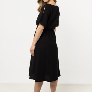 Ta sukienka to idealne połączenie klasyki i wygody. Luźny fason zapewnia swobodę, a gumka w pasie subtelnie podkreśla talię. Krótkie, rozcięte rękawy dodają lekkości, a dekolt w łódkę elegancko eksponuje linię ramion. To uniwersalna propozycja na codzienne i wyjątkowe okazje.
