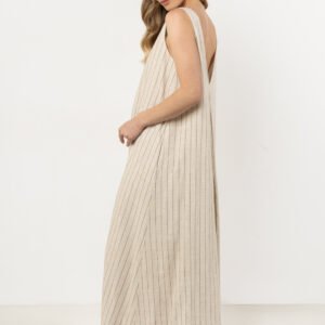 Luźna, trapezowa sukienka lniana maxi w delikatne prążki Lekkość i elegancja, ta sukienka to idealny wybór na ciepłe dni. Zwiewny trapezowy krój zapewnia swobodę, a naturalna, lniana tkanina gwarantuje komfort noszenia. Dekolt łódka z przodu i odkryte plecy w kształcie litery V dodają subtelnej zmysłowości. Bawełniana podszewka zwiększa przewiewność, czyniąc sukienkę jeszcze bardziej komfortową.