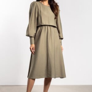Elegancka sukienka midi o swobodnym kroju łączy wygodę z kobiecym stylem. Luźniejsza góra harmonijnie współgra z elastycznym pasem, który podkreśla talię i sylwetkę. Długie rękawy z szerokimi mankietami i guzikami dodają elegancji, a zaokrąglony dekolt zapewnia ponadczasowy wygląd. Długość za kolano sprawia, że sukienka nadaje się zarówno na co dzień, jak i na bardziej formalne okazje, zachowując klasyczny i szykowny charakter.