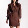 Sukienka mini o eleganckim kroju to świetny wybór na uroczyste okazje. Dopasowana góra z głębokim dekoltem V subtelnie podkreśla biust, a marszczenie w talii optycznie wysmukla sylwetkę. Długie bufiaste rękawy z mankietami i guzikami dodają modnego akcentu. Krótka długość eksponuje nogi, czyniąc sukienkę idealną na eleganckie przyjęcia i wyjątkowe wydarzenia.