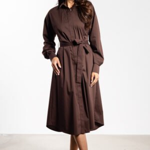 Sukienka midi o koszulowym fasonie łączy klasykę z wygodą. Prosta linia z guziczkami na całej długości sprawia, że model sprawdzi się na wiele okazji. Klasyczny kołnierzyk i długie rękawy z mankietami podkreślają elegancki charakter. Pasek z tego samego materiału pozwala nosić sukienkę luźno lub przewiązaną w talii, akcentując kobiece proporcje sylwetki. Długość za kolano nadaje jej uniwersalności, idealna do pracy, spotkań i wyjątkowych okazji.