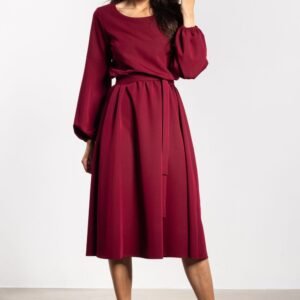 Sukienka midi o luźnym kroju łączy wygodę z elegancją. Gumka w talii dopasowuje się do sylwetki, a dołączony pasek dodatkowo podkreśla kobiece kształty. Długie bufiaste rękawy zakończone delikatnym marszczeniem nadają lekkości, a prosty okrągły dekolt sprawia, że model pozostaje uniwersalny i szykowny. Lekko rozkloszowany dół i długość za kolano dodają stylizacji klasy i swobody, czyniąc sukienkę odpowiednią zarówno na co dzień, jak i na eleganckie okazje.