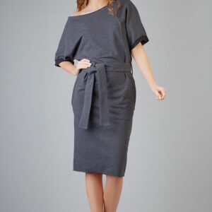 Elegancka sukienka z dzianiny. Rękaw wykończony ozdobnym mankietem, dekolt i dół sukienki wykończony na surowo. Fason sukienki luźny, typu kimono. Kieszenie w szwie.