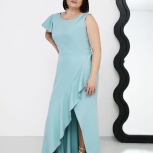 Dopasowana sukienka na jedno ramię, po drugiej stronie krótki rękawek w formie falbanki. Sukienka zapinana na zamek, z falbaną u dołu. Idealna na wiele okazji.