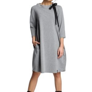 Dla miłośniczek luźniejszych fasonów, wygodna sukienka z kieszeniami i ozdobnym wiązaniem pod szyją. W chłodniejsze dni może posłużyć jako tunika do spodni, czy legginsów.