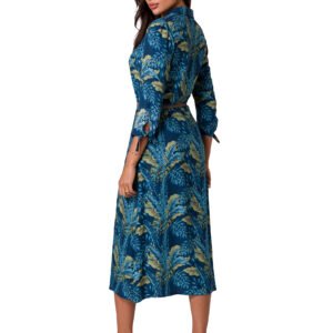 Sukienka o fasonie litry A, z kołnierzykiem, rozpinana na przodzie i przewiązana paskiem z klamerką, kwintesencja kobiecości.