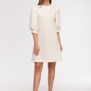 Lekka i stylowa sukienka o swobodnym, niedopasowanym fasonie to idealny wybór na co dzień, sprawdzi się zarówno podczas wakacyjnych wyjazdów, jak i spacerów w mieście. Uszyta w Polsce, z myślą o komforcie i kobiecym stylu, zachwyca subtelnym krojem w kształcie litery A, który delikatnie rozszerza się ku dołowi, zapewniając swobodę ruchów. Sukienka sięga przed kolano, posiada okrągły dekolt pod szyję oraz efektowne rękawy 3/4, bufiasty krój z marszczeniem i wykończeniem w formie mankietu dodaje całości romantycznego charakteru. Brak podszewki sprawia, że model jest przewiewny i lekki, idealny na cieplejsze dni. Dzięki swojemu krojowi sukienka pasuje do wielu typów sylwetek, a szczególnie dobrze prezentuje się na figurze typu Y, rozszerzany dół równoważy proporcje między ramionami a biodrami.