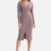 Sukienka wykonana z wysokiej jakości prążkowanej dzianiny o gramaturze 250 g, która pięknie układa się na sylwetce i zapewnia komfort noszenia. Model wkładany przez głowę, bez kieszeni i podszewki, utrzymany w nowoczesnym, kobiecym stylu. Stójka pod szyję nadaje elegancji i subtelnie wydłuża szyję, a długie, dopasowane rękawy z wycięciem na kciuk podkreślają smukłość ramion i nadają całości sportowego charakteru. Fason łączy dopasowaną górę z odcięciem na linii bioder i lekko rozkloszowanym dołem, co pięknie modeluje sylwetkę, podkreśla talię i dodaje lekkości w ruchu. Długość midi, do połowy łydki, sprawia, że sukienka jest jednocześnie kobieca, elegancka i praktyczna. Zaprojektowana i uszyta w Polsce z dzianiny wyprodukowanej w Łodzi, to połączenie jakości, wygody i ponadczasowego stylu.