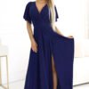 Chiara elegancka maxi długa satynowa suknia na ramiączkach. Pięknie wyprofilowany dekolt i rozcięcie na spódnicy tworzy niecodzienną kompozycję. Uszyta z połyskującej, gładkiej, lekko elastycznej satyny w kolorze czerwonym. Sukienka idealna na wesela, sylwestra, studniówkę, karnawał i inne ważniejsze wyjścia. Produkcja polska. Marka Numoco.