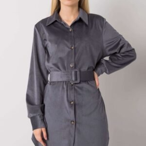 Grafitowa sukienka zapinana na guziki z długim rękawem. Pasek dopełnia całości stylizacji.