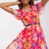Letnia sukienka z krótkim rękawkiem w formie falbanek. Sukienka z podszewką. Dekolt kopertowy, w pasie pasek, dół plisowany. Idealna propozycja na wiele okazji.