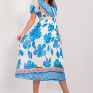 Letnia sukienka z krótkim rękawkiem w formie falbanek. Sukienka z podszewką. Dekolt kopertowy, w pasie zapinany pasek, dół plisowany. Idealna propozycja na wiele okazji.