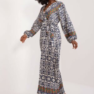 Ta maxi sukienka z kolorowym nadrukiem to idealny wybór na różne okazje, zarówno codzienne, jak i wizytowe. Wykonana z dominującego poliestru, jest trwała i wygodna w noszeniu. Sukienka posiada kopertowy dekolt, który dodaje jej elegancji i kobiecości. Rozkloszowany fason zapewnia swobodę ruchów i stylowy wygląd, a bufiasty, długi rękaw dodaje jej wyrafinowania. Sukienka wyposażona jest w pasek do wiązania, który podkreśla talię, nadając sylwetce piękny kształt. Kolorowy nadruk sprawia, że sukienka jest wyjątkowa i przyciąga wzrok, doskonale nadając się na różnorodne okazje.