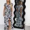 Olśniewająca długa sukienka z subtelnym połyskiem to doskonały wybór na wieczorne wyjścia i wyjątkowe uroczystości. Delikatne rękawki w formie falbanek dodają lekkości i romantycznego uroku, a okrągły dekolt z efektownym pęknięciem pięknie eksponuje szyję. Marszczenie w pasie podkreśla talię i optycznie wysmukla sylwetkę, zapewniając jednocześnie wygodne dopasowanie. Kopertowy dół nadaje sukni kobiecego charakteru i zapewnia swobodę ruchu, a kryty zamek z tyłu gwarantuje estetyczne wykończenie. To kreacja, która łączy elegancję z nutą nowoczesności.