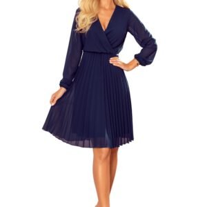 Plisowana szyfonowa sukienka z dekoltem i długim rękawkiem, w kolorze granatowym. Marka numoco. Produkcja polska.