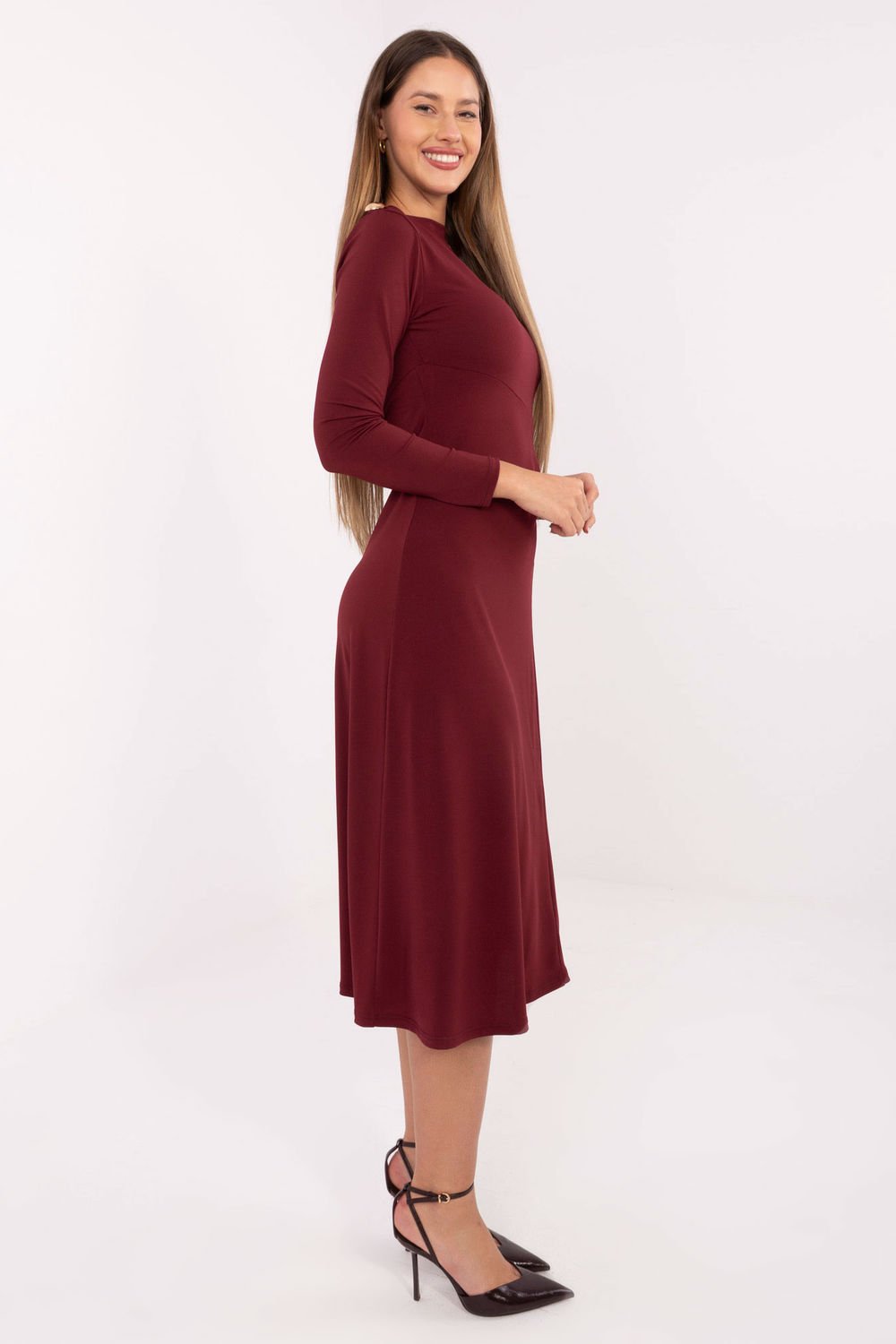 Elegancka sukienka midi, idealna na różne okazje od codziennych wyjść, przez stylizacje do pracy, aż po wizytowe spotkania. Wykonana z dominującej mieszanki poliestru i wiskozy, zapewnia komfort noszenia, przewiewność oraz delikatne dopasowanie do sylwetki. Model wyróżnia się gładkim, klasycznym wzorem, który podkreśla ponadczasowy charakter sukienki. Dekolt typu łódka nadaje całości subtelnej elegancji, a długi rękaw sprawia, że kreacja świetnie sprawdza się o każdej porze roku. Wyjątkowego szyku dodają metalowe, ozdobne elementy umieszczone na prawym ramieniu oraz po lewej stronie w talii. W tych miejscach sukienkę wykończono również delikatnymi marszczeniami, które pięknie modelują sylwetkę i przyciągają wzrok. Sukienka nie posiada zapięcia, dzięki czemu jest wygodna w zakładaniu i układa się naturalnie na ciele. To doskonała propozycja dla kobiet, które cenią klasykę z nutą nowoczesnych detali.