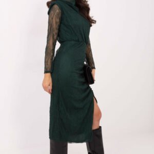 Elegancka sukienka koronkowa o klasycznym, a zarazem bardzo kobiecym charakterze, idealna na wizytowe okazje. Ołówkowy fason pięknie podkreśla sylwetkę, a wszyta w pasie guma zapewnia wygodę noszenia oraz doskonałe dopasowanie do figury. Model został wykonany z wysokiej jakości wiskozy z dodatkiem elastanu, dzięki czemu materiał jest miękki, elastyczny i komfortowy w użytkowaniu. Urozmaicona faktura materiału oraz koronka nadają sukience eleganckiego i luksusowego wyglądu. Długość midi w połączeniu z długim rękawem sprawia, że całość prezentuje się niezwykle stylowo i ponadczasowo. Efektowny lejący dekolt dodaje lekkości i subtelnej zmysłowości, natomiast marszczenia na przodzie u dołu z rozcięciem podkreślają sylwetkę i zapewniają swobodę ruchów. Sukienka nie posiada zapięcia i jest zakładana przez głowę. Model wyposażony jest w poduszki na ramionach, które nadają eleganckiej formy i podkreślają linię ramion, oraz w podszewkę, z wyłączeniem rękawów, co zwiększa komfort i estetykę wykończenia. To doskonały wybór na uroczystości, oficjalne spotkania i wyjątkowe wyjścia.