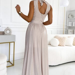 Justine maxi długa suknia z dekoltem, rozcięciem na nogę i wiązaniem na plecach. Uszyta z elastycznego materiału. Sukienka w kolorze beżowym z brokatem. Zapinana z tyłu na kryty zamek. Produkt polski. Marka numoco.