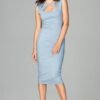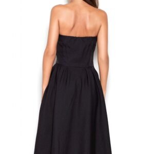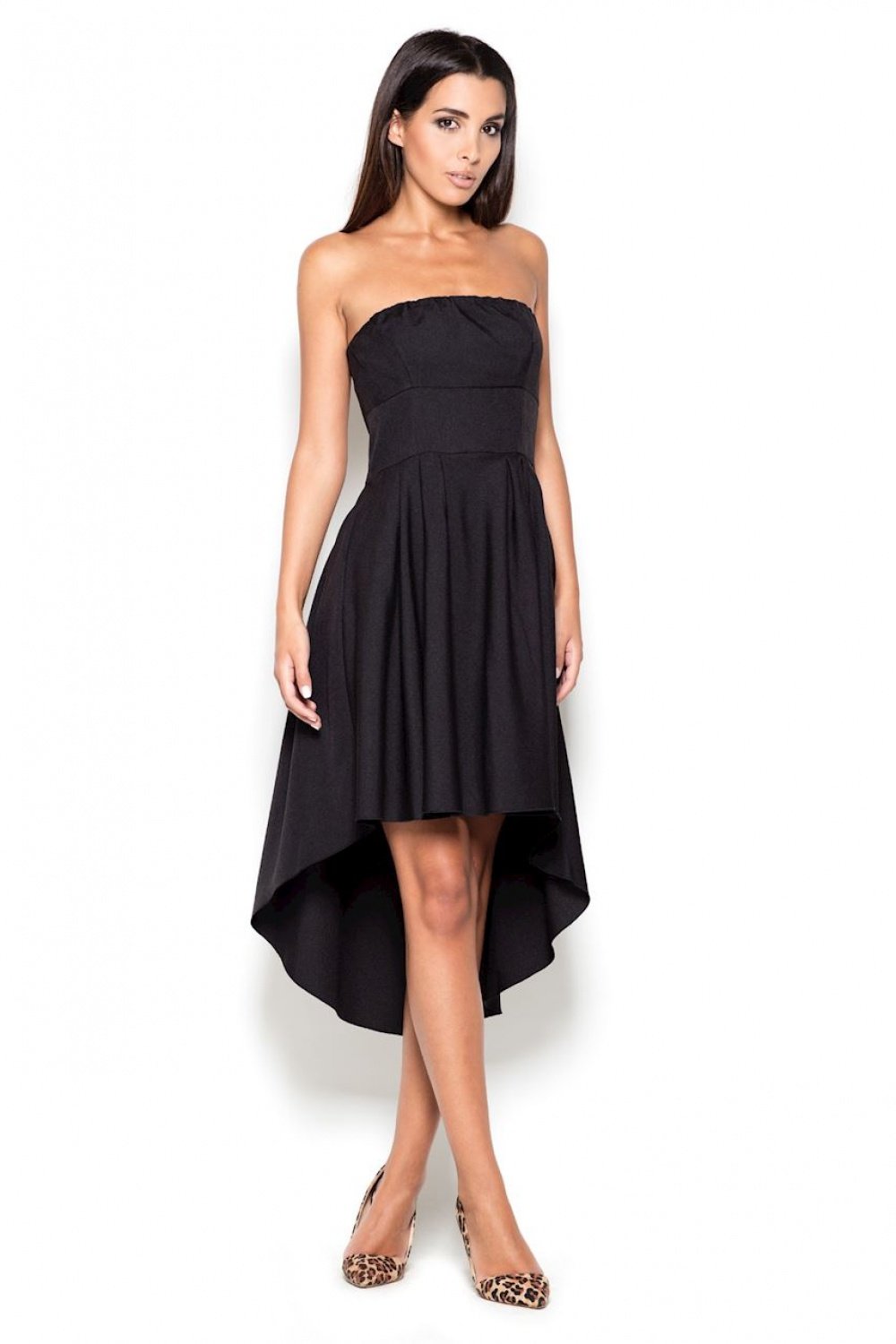 Asymetryczna sukienka z krótszym przodem, bez ramiączek. Tył sukienki wygląda identycznie jak przód z tą różnicą że jest dłuższy. Na biuście sukienka trzyma się na mocnej gumce nie powodującej uciskania.