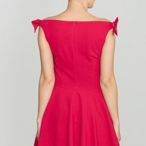 Fason doskonale dopasowuje się do sylwetki, podkreślając kobiece kształty. Góra z ładnie wyprofilowanym dekoltem bez rękawów, który zastępują kokardki na ramieniu nadające sukience uroczego stylu.