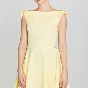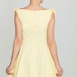 Fason doskonale dopasowuje się do sylwetki, podkreślając kobiece kształty. Góra z ładnie wyprofilowanym dekoltem bez rękawów, który zastępują kokardki na ramieniu nadające sukience uroczego stylu.