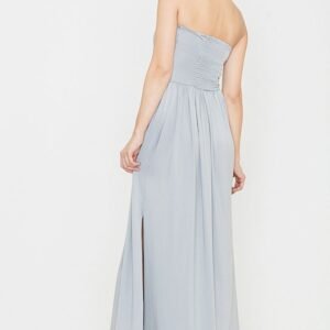 Sukienka z delikatnego materiałów modnej długości maxi. Gorsetowa góra doskonale eksponuje dekolt i ramiona, świetnie współgra długim dołem. W gorsecie podwójna warstwa materiału. Sukienka jest odcinana na wysokości tali. Dół gęsto marszczony miękko opływa sylwetkę nadając jej kobiecego charakteru. Na boku długie rozcięcie pozwalające wyeksponować zgrabne nogi.