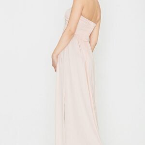 Sukienka z delikatnego materiałów modnej długości maxi. Gorsetowa góra doskonale eksponuje dekolt i ramiona, świetnie współgra długim dołem. W gorsecie podwójna warstwa materiału. Sukienka jest odcinana na wysokości tali. Dół gęsto marszczony miękko opływa sylwetkę nadając jej kobiecego charakteru. Na boku długie rozcięcie pozwalające wyeksponować zgrabne nogi.
