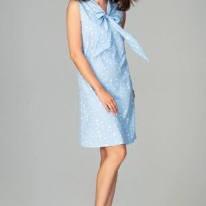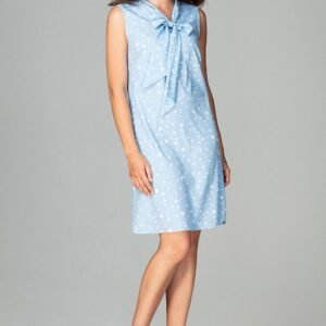 Elegancka, zwiewna sukienka bez rękawów. Ma luźną formę i jest idealna dla Pań ceniących sobie nowoczesność i kobiecość. Pod szyją wykończona jest małą stójką, która zakończona jest dekoracyjnym wiązaniem.