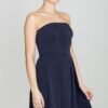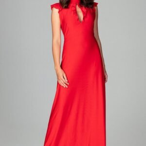Wytworna sukienka maxi, w talii dopasowana, dołem delikatnie rozkloszowana. Pięknie podkreśli kobiecość i elegancję. Model na ramionach i w dekolcie ma ozdobne falbanki, z tyłu wiązana, a górą zapinana na guziczek.