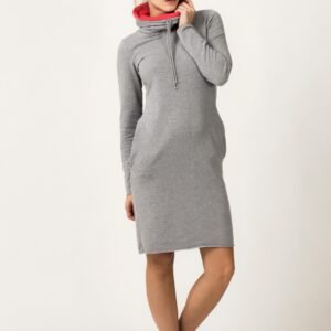 Sportowa sukienka z praktycznymi kieszeniami wpuszczanymi w szwie na bokach uszyta z kolorowej dzianiny dresowej. Dekolt komin, który można postawić lub wywinąć, co da efekt golfu, rękawy długie ok.62 cm. Wewnętrzna część komina w kontrastowym kolorze. Oryginalne surowe zakończenie u dołu jak i przy rękawach można efektownie wywijać, manipulując długością sukienki i rękawów. Wysokość komina 23 cm.