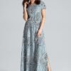 Sukienka o lekko rozszerzanym fasonie z rękawem 3/4. Przy dekolcie łezka z ozdobnym zapięciem. Trapezowy fason doskonały będzie dla wielu typów sylwetek.