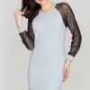 Sukienka z rękawem o długości 3/4 wykonana z miękkiej, wiskozowej dzianiny. Góra jest prosta z okrągłym dekoltem z kontrastową, transparentną wstawką. Wyróżnia ją dół z asymetrycznym wycięciem na przodzie w dolnej partii.