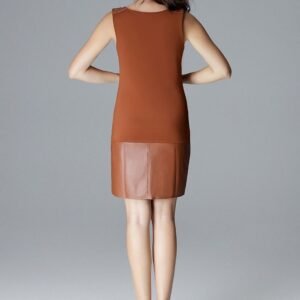 Prosty, opływający krój będzie doskonały dla wielu typów sylwetek. Sukienka bez rękawów z ozdobnymi guzikami i ekoskórką na ramionach. Dół sukienki również uszyto z ekoskórki nadającej jej nowoczesnego i modnego stylu.