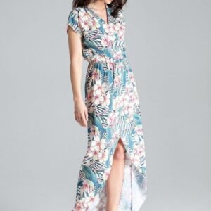 Długa sukienka z kimonowym rękawem, w pasie z gumką. Fason górą i dołem przekładany na prawą stronę. Z przodu rozcięcie dodające szyku i elegancji. Model świetnie sprawdzi się na wiele okazji.