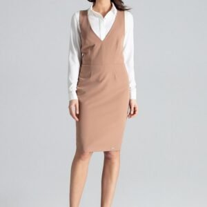 Sukienka midi bez rękawów z dopasowaną górą. Duży dekolt w szpic. Odkryte plecy. Zapinana z tyłu na kryty zamek oraz ozdobne szelki zapinane na zatrzaski. Sukienka bez kieszeni z podszewką.
