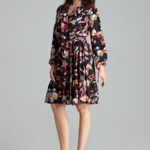 Sukienka midi w kwiaty z długim rękawem zakończonym marszczeniem z wszytą gumką. Kopertowy dekolt. Spódnica z falbaną w dolnej części, w pasie odcinana, wszyta gumka oraz dodatkowo szarfa do wiązania.