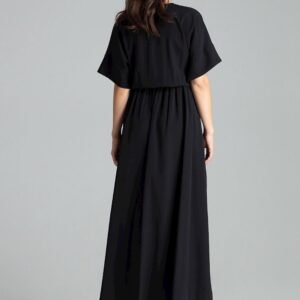 Czarna długa sukienka z krótkim, kimonowym rękawem zakończonym mankietem. Spódnica długa odcinana w pasie, lekko rozkloszowana z bocznymi rozcięciami. W pasie wszyta gumka. Kopertowy dekolt.