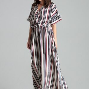 Długa sukienka w paski z krótkim, kimonowym rękawem zakończonym mankietem. Spódnica długa odcinana w pasie, lekko rozkloszowana z bocznymi rozcięciami. W pasie wszyta gumka. Kopertowy dekolt.