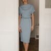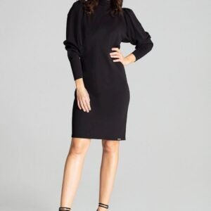 Czarna dopasowana sukienka midi z długim bufiastym rękawem. Marszczony golf. Zapinana z tyłu na kryty zamek.