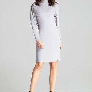 Szara dopasowana sukienka midi z długim bufiastym rękawem. Marszczony golf. Zapinana z tyłu na kryty zamek.