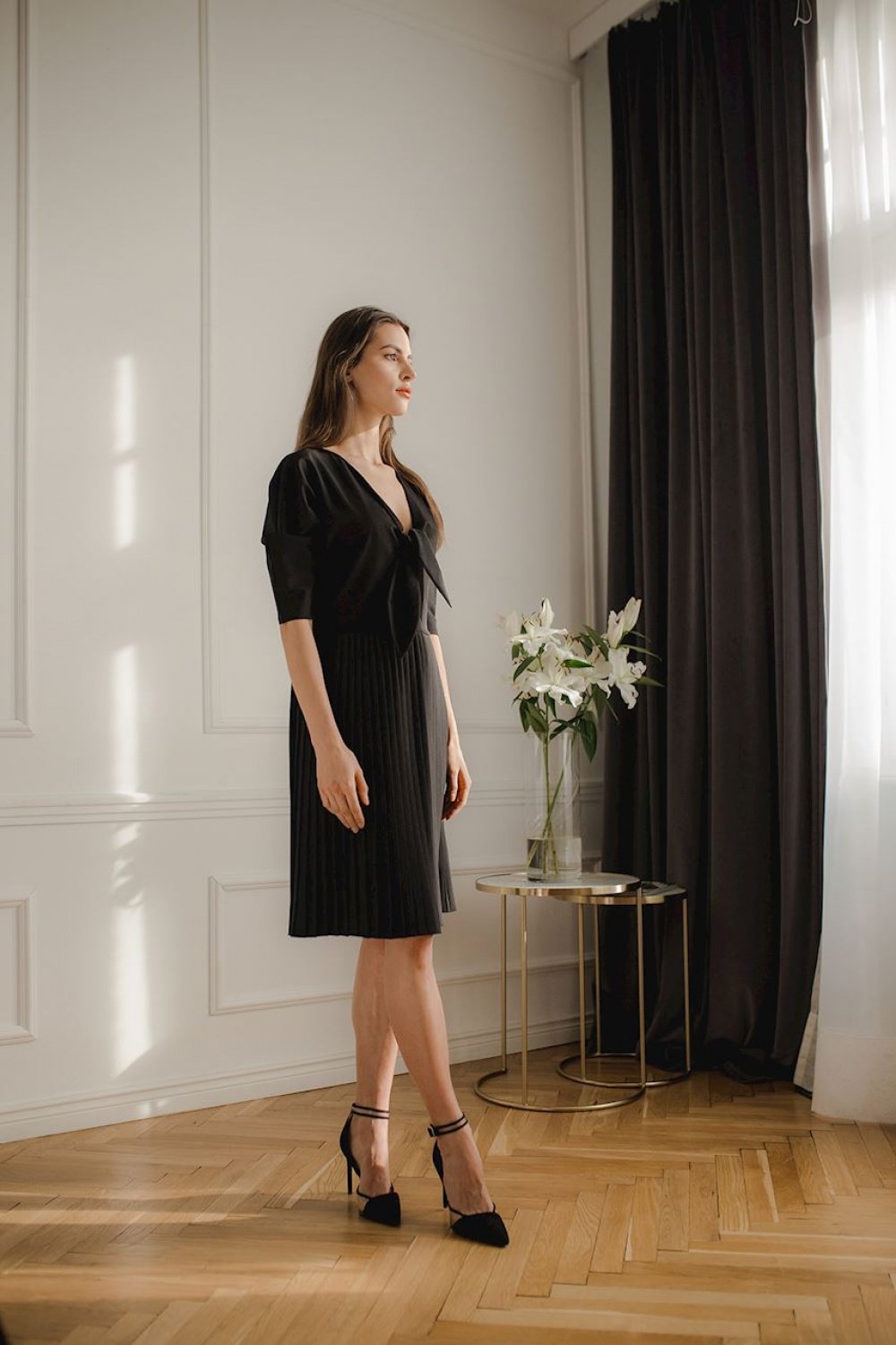Czarna wiosenna sukienka midi z lekkiego zwiewnego materiału, z kimonowym rękawem 3. Dekolt w serek, wiązana na biuście. Plisowany dół, zapinana z boku na kryty zamek.