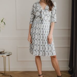 Wiosenna sukienka midi we wzory z lekkiego zwiewnego materiału, z kimonowym rękawem 3. Dekolt w serek, wiązana na biuście. Plisowany dół, zapinana z boku na kryty zamek.